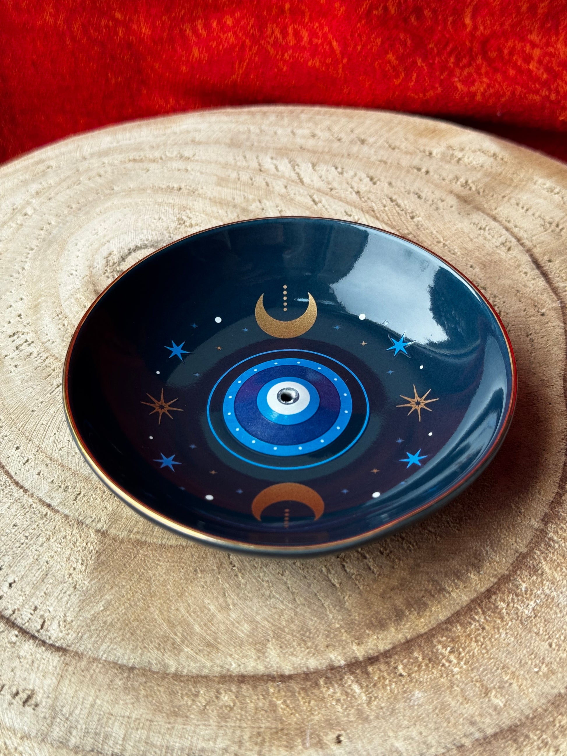 Porte encens au motif de Nazar boncuk, l'amulette "œil de protection" bien connu en Méditerranée et au Moyen-Orient. Idéal pour les encens en batônnets.